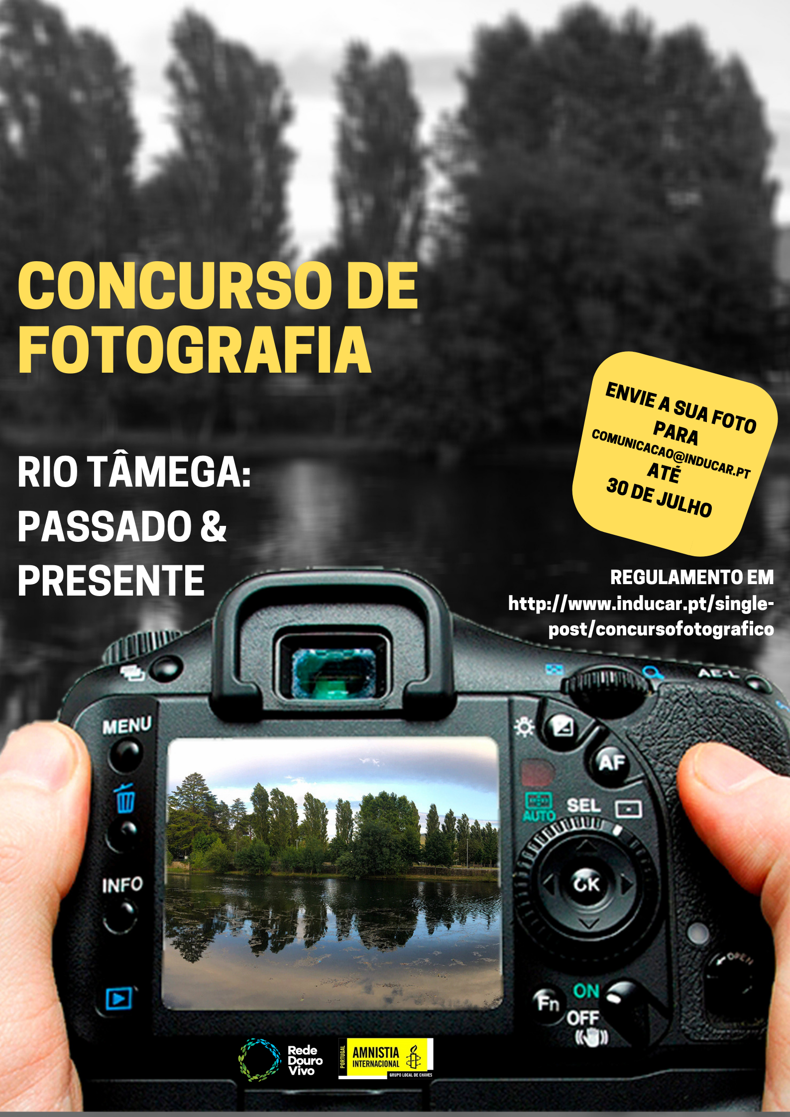 DO REGULAMENTO 1. O concurso é organizado pela Rede Douro Vivo, através da Rede Inducar e do Grupo 36 da Amnistia Internacional (Chaves). 2. O concurso destina-se a todos e todas interessad@s no rio Tâmega. 3. O título do concurso é: “Tâmega: passado e presente”. 4. O tema do concurso é o rio Tâmega no passado e atualmente. 5. Cada pessoa poderá participar com um máximo de 3 fotografias. 6. Só são admitidas a concurso as fotografias que contemplem os seguintes dados: identificação do(a)(os)(as) autor(a)(es)(as), título da fotografia (preferencialmente, mas poderá não ter título), data da fotografia do passado e fotografia do mesmo local e perspetiva com data atual (relacionadas com o rio Tâmega e/ou as suas margens e os seus afluentes) e localização da fotografia (GPS, referência, nome de rua ou lugar). 7. São admissíveis todas as técnicas aplicadas à fotografia digital, bem como ao tratamento de fotografia. 8. Deverá ser enviado um exemplar de cada fotografia (no caso da fotografia antiga solicitamos uma digitalização na máxima qualidade). 9. O tamanho de cada fotografia (na vertical ou na horizontal) não deverá ultrapassar os 10 MG de ficheiro. 10. Todos os concorrentes deverão enviar as suas fotos até às 24 horas do dia 30 de julho de 2019, para o endereço eletrónico comunicacao@inducar.pt. 11. Todas as fotografias admitidas a concurso serão utilizadas pela organização deste concurso para exposição, publicação nos media, cedendo o autor os direitos à publicação desde que devidamente identificados o(s) autor(es). É obrigatório o preenchimento de “autorização de recolha, tratamento e divulgação de imagens” através do seguinte link: https://forms.gle/DNxD44QiHGfYZM1t8. A mesma autorização deve ser preenchida com o mesmo email utilizado para o envio das fotografias. 12. Cada concorrente, se assim o desejar, poderá colocar a sua marca na respetiva fotografia. 13. Esta iniciativa contempla dois formatos: concurso e mostra. 14. Na modalidade “concurso”, as fotografias estão submetidas a avaliação de público e júri; na modalidade “mostra”, as fotografias estão presentes na exposição, mas não estão submetidas a qualquer votação. No momento da inscrição, a/o autor/a deverá designar a modalidade a que pretende aderir e poderá alterar a sua decisão até ao dia final de entrega de fotografias.