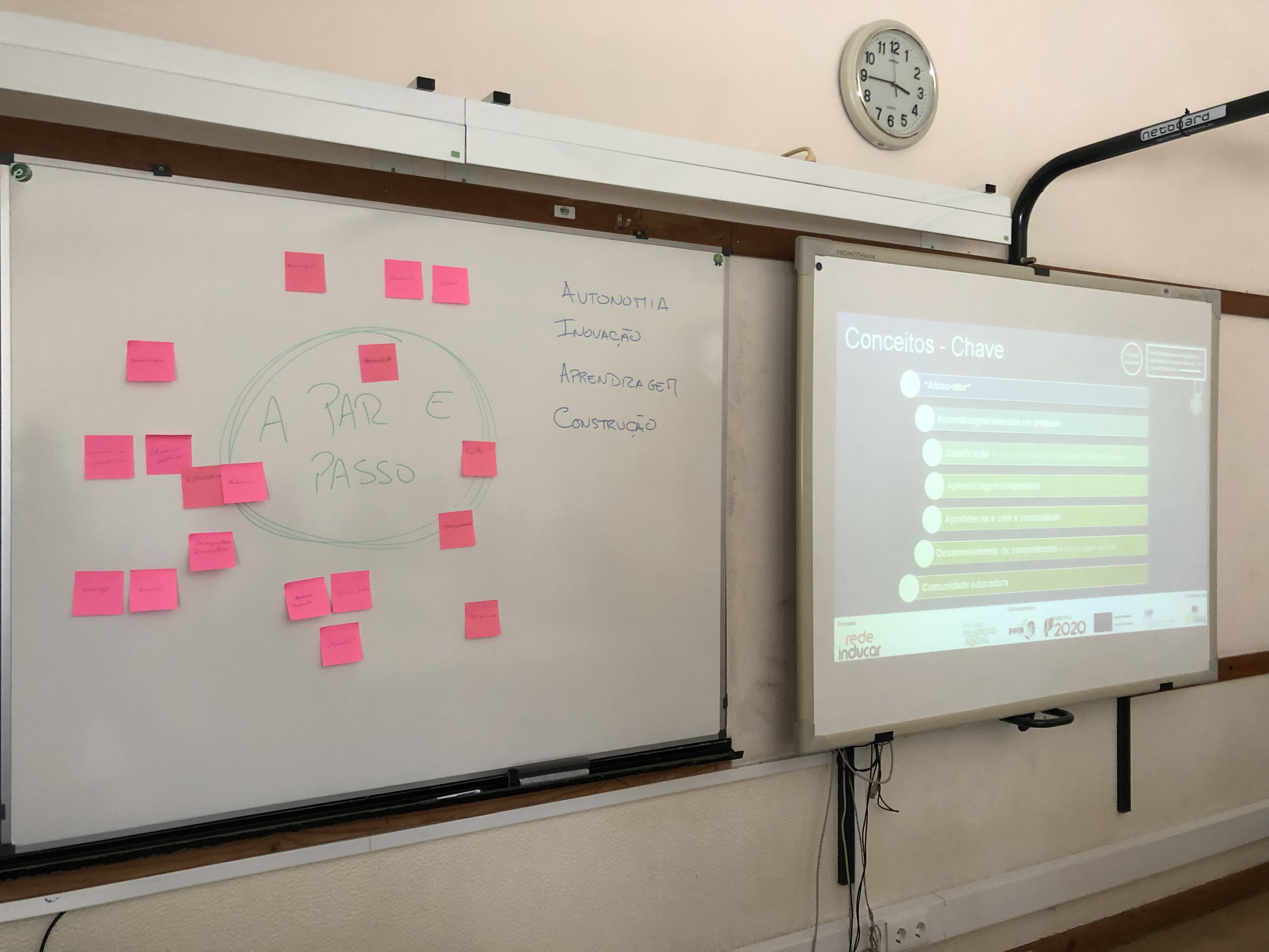 O projeto A Par e Passo realizou, a 26 de abril, o 1º Workshop na Escola EB2,3 da Arrifana. O momento colocou em comum a génese do projeto e contou com o grupo de professores e professoras que irão trabalhar, de forma colaborativa, nos próximos dois anos. "Refletimos sobre conceitos-chave que todos e todas consideraram ser fundamentais para o sucesso deste projeto, nomeadamente autonomia, inovação, aprendizagem e construção. Foi um momento não formal, em que os professores e professoras puderam partilhar a interpretação de conceitos que a equipa de projeto considerou poderem ser a base da intervenção, nomeadamente aprendizagem baseada em projetos, comunidade educadora, desenvolvimento de competências, gamificação e aprendizagem cooperativa, tendo esta partilha tendo sido realizada com recurso a diferentes materiais", explica Inês Carvalho, coordenadora do A Par e Passo.
